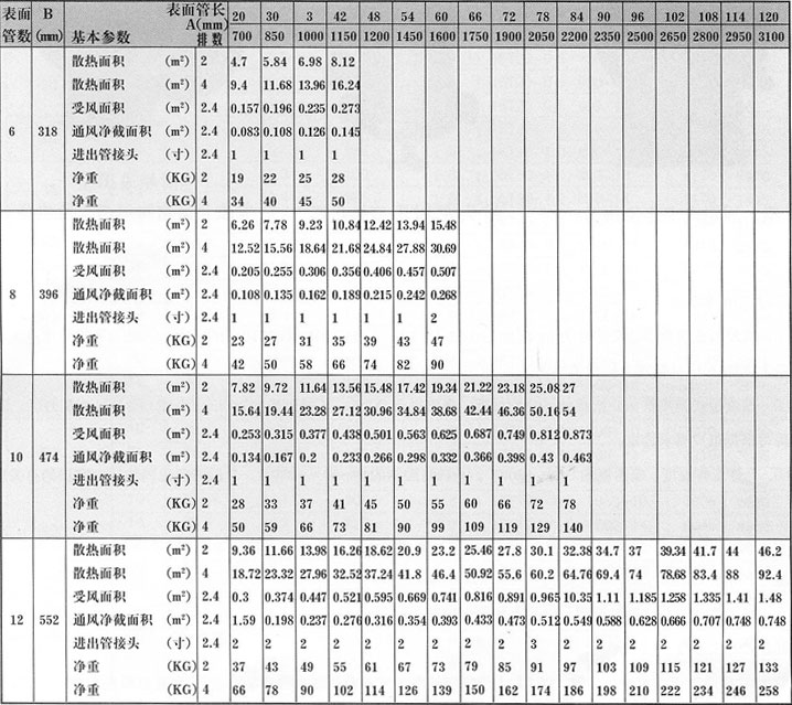 型號(hào)—排數(shù)—表面管數(shù)—表面管長(zhǎng)(英寸)